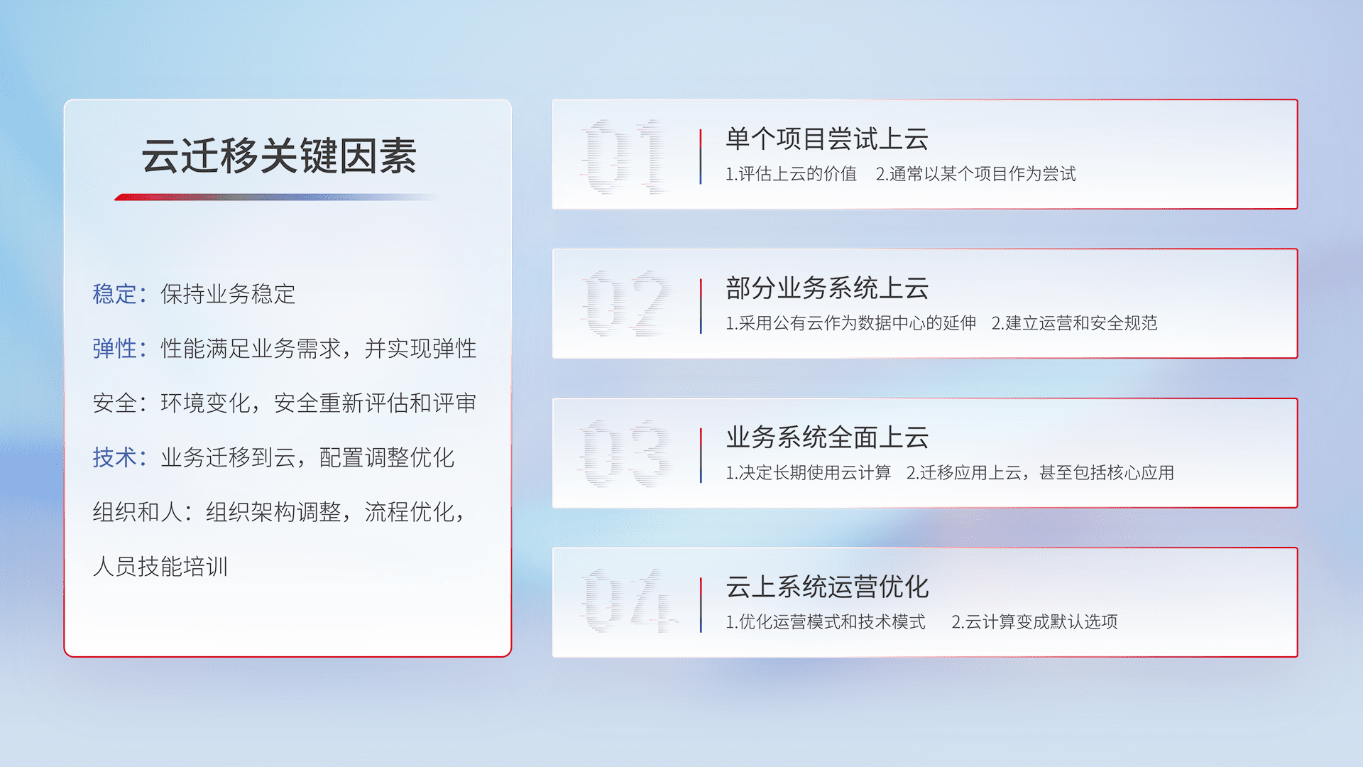 结合实际业务,,,,从规划设计、、云平台选型、、、云原生改造、、、、数据迁移、、集成交付,,迁移全过程为客户识别最佳上云路径,,,做好风险识别管理,,,,设计网络架构、、身份权限、、、安全审计合规、、、操作审计、、、、日志审计、、监控告警策略、、、、多站点容灾设计等,,对云上基础设施进行整体规划,,,提升IT治理水平,,,,以满足弹性、、、、高可用、、、、高性能的需求。。。