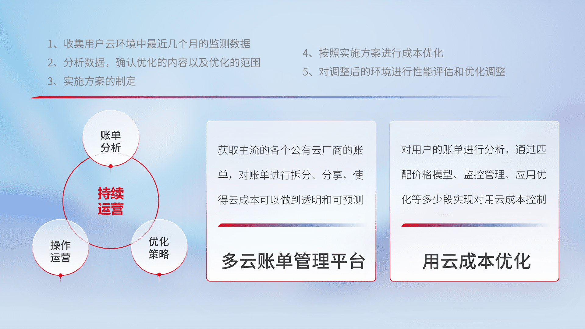 通过多云纳管,,,,以统一的资源数据模型把客户的云资源进行抽象和封装,,,进而实现对多云资源的统一操作,,,保障云资源管理的可靠性、、稳定性与可用性。。。量身定制化运维内容,,,,配置、、开发运维、、补丁管理、、、、备份、、监控、、、认证和访问管理、、、审计和日常巡检等,,保障在用云过程中的可靠度,,,稳定度以及高可用率。。。